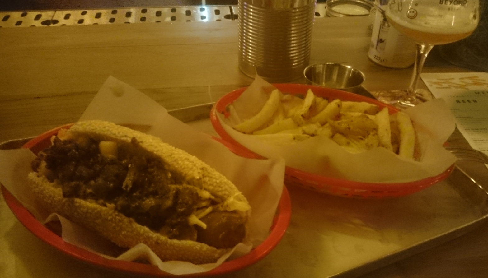 Dort gab es To Øl-Biere vom Fass und fermentierte Hot Dogs und Fritten.